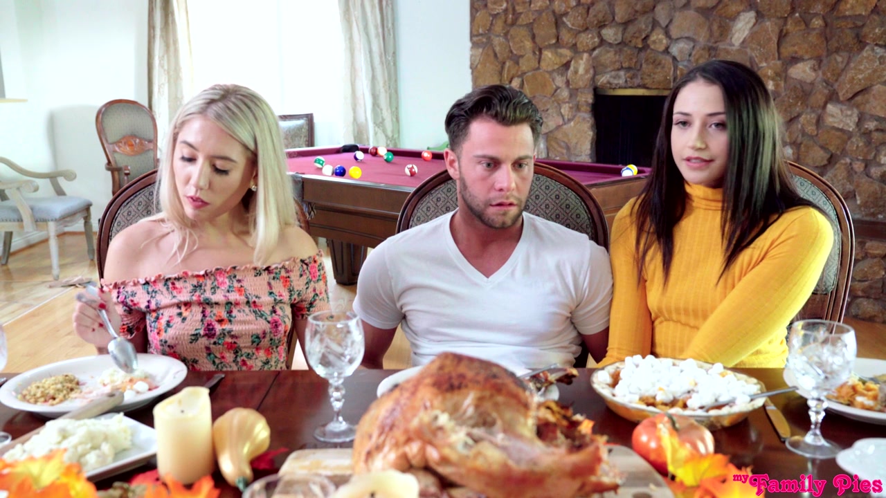 Ави и Пейсли уже давно не видели друга детства. Сегодня он приглашен к ним в честь Дня Благодарения. Сводных сестер приятно удивил тот факт, каким симпатичным мачо он стал, и они тут же начали с ним флиртовать. Пока родители готовили праздничные блюда, Ави и Пейсли накрывали на стол. Улучив удобный момент, телочки засветили перед гостем свои аппетитные сиськи, чем немного смутили парня. За праздничным столом парень оказался между двух сестер, и каждая пыталась обратить его внимание на себя. Пейсли под столом достала из штанов член парня и принялась ласкать его рукой, а Ави к ней присоединилась. Как только родители ушли из-за стола, телочки принялись по очереди сосать член парня, а потом Ави получает ствол парня в пилотку. Пока он трахает ее возле стола, Пейсли ласкает языком ее щелку. Потом телочки меняются местами. Секс двух сводных сестер на столе со старым другом закончился оргазмом, а брюнетка даже получила полную пилотку густой спермы.