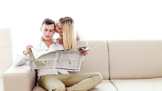 Русская блондинка нежно целует своего парня и дотрагивается до его члена сквозь штаны, чтобы посмотреть, возбужден ли он так же сильно, как и она. Убедившись в том, что ствол парня стал каменным, юная девушка берется его отсасывать, ведь она так сильно хочет секса. Пока блондинка делает минет, парень запускает руку в ее лосины и ласкает розовую щелочку, чтобы разгорячить ее перед проникновением. Раздев красотку, он укладывает ее на диван и одаривает нежными оральными ласками. После куни ее киска точно готова принять разгоряченный член. Отымев девицу как следует он вставляет член в ее ротик, чтобы она еще немного пососала и насладилась свежей спермой.