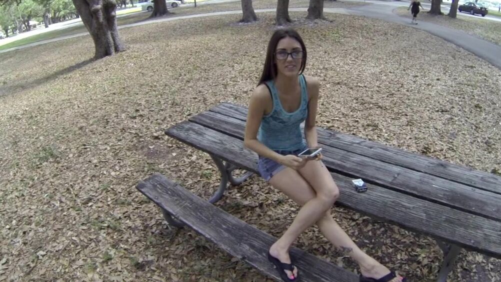 Парень заметил на улице брюнетку и решил с ней познакомиться. Несмотря на то, что у девушки есть парень, она все равно согласилась отправиться с незнакомцем к нему домой. Уже на заднем дворе своего дома он смог уговорить брюнетку отсосать, а потом и трахнуться с ним за деньги. Ради денежного вознаграждения эта сучка забыла обо всем на свете и принялась сосать горячий пенис. Когда девица подставила свою пизду, то парень от первого лица выебал брюнетку, заставляя ее стонать от удовольствия. Облив ее плоский живот густой спермой, парень остался доволен, но не стал говорить, что все снял на скрытую в очках камеру.