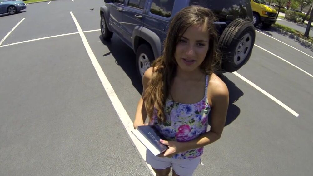 Милая брюнетка на парковке собирала пожертвования для одной церкви. Парень был очень обходителен с ней, поэтому скромная милашка, не раздумывая села к нему в машину, ведь он обещал пожертвовать деньги на церковь, как только они доберутся до дома. За щедрые пожертвования милашка согласилась отблагодарить этого парня особенным способом, взяв большой член в рот. Эта сучка оказалась не такой уж скромницей, вы только посмотрите, как страстно она сосет ствол. Встав раком на диване, брюнетка ебется с самцом в киску и реально кайфует от этого случайного секса. Отымев девку с упругой задницей от первого лица, он поливает ее булки густой спермой.