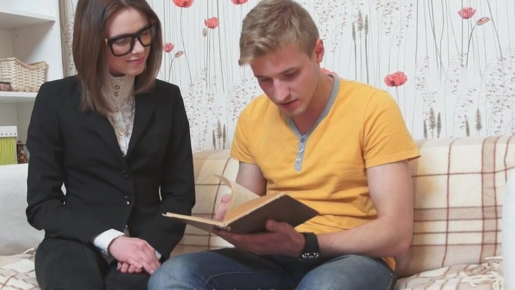 Увидев симпатичную студентку в очках, которая сидела в парке и изучала учебник по геометрии, русский парень не смог пройти мимо. Разговорившись, он предложил девушке свою помощь в подготовке к экзамену, и та согласилась. Как только они оказались у него дома, то, конечно, по началу думали только об учебе. Но спустя какое-то время оба почувствовали напряжение и решили заняться чем-то более интересным. Раздев девушку в очках, гостеприимный хозяин дома побаловал ее нежным куни, а потом подставил свой член для отсоса. После возбужденная оральными ласками парочка занялась жарким сексом на диване, постоянно меняя позы и постанывая от кайфа, пока оба не кончили и телка не получила камшот на очки.