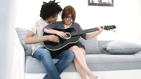 Молодой телочке в очках так нравится музыка, что она решает брать частные уроки игры на гитаре. Молодой преподаватель, показав красотке пару аккордов, решает, что их частный урок должен быть не таким скучным, поэтому он и лезет целоваться к ней. Стянув с короткостриженой красотки трусики, парень начинает языком водить по ее клитору, возбуждая цыпочку оральными ласками. Разгоряченная куни красотка сосет член своего репетитора, а после седлает его, чтобы прокатиться и получить порцию яркого удовольствия. Девица с маленькими сиськами ебется раком с парнем и получает сперму внутрь. Густая белая жидкость красиво вытекает из ее пизды.