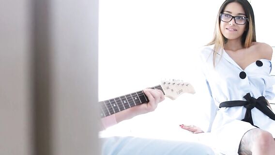 Девочка-меломанка любит слушать, как играет на гитаре ее приятель. Этот парень так нежно обращается с музыкальным инструментом, что красотке не терпится узнать, какими будут его прикосновения к ее роскошному телу. Русская красотка в очках дает парню отлизать свою бритую пизду, а в ответ сосет его мощный член. Возбужденная взаимными оральными ласками парочка принимается трахаться в разных позах. В начале телка с татуировками дала в пизду, а потом дала гитаристку в анал, чтобы испытать самый яркий и незабываемый экстаз. Отымев подружку в упругую задницу, парень обливает ее аппетитную попку густой спермой.