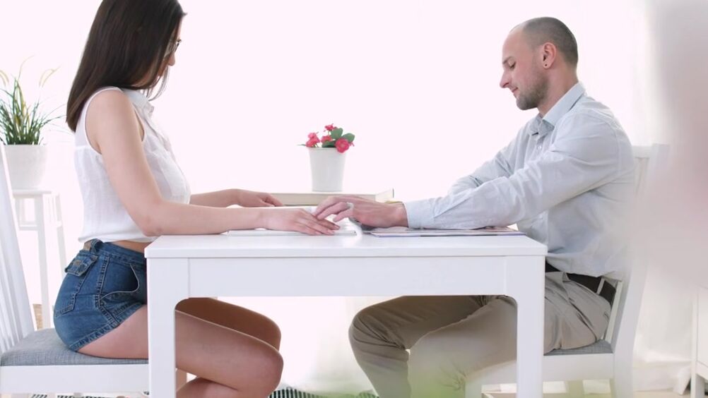 Молодая брюнетка в очках внимательно изучает новые журналы по дизайну. Эта цыпочка настолько притягательна, что парень решил отвлечь дизайнершу от работы и расслабиться в ее компании. Горячий самец нежно ласкал ее натуральные сиськи, а она глубоко заглатывала его большой член. Возбужденный минетом парень уложил красотку на огромный пуфик и вылизал ее киску, а потом уже трахнул. Брюнетка нежно стонала в то время, пока в ее сочной пизде орудовал каменный стояк этого возбужденного парня. Красотка с наслаждением скакала верхом на члене, трахалась раком, а в конце получила камшот на попку.
