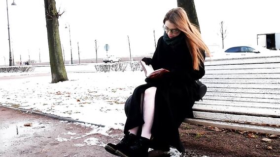 В зимнем парке на холоде симпатичная телочка в очках читала книжку и уже явно замерзла. Увидев ее, парень не стал проезжать мимо. Русский парень познакомился с телочкой и подвез рыжую студентку до дома. Девушка была настолько благодарно этому парню, что решила его отблагодарить. Усевшись на колени к парню, она начала раздеваться и целоваться. Засветив свои маленькие сиськи перед ним, телочка полезла к парню в штаны, чтобы разгорячить его минетом. После отсоса он посадил рыженькую цыпочку на ствол и трахнул ее так, что нежные стоны ее удовольствия были слышны всем соседям. Отымев девицу в разных позах, он кончил ей на очки.