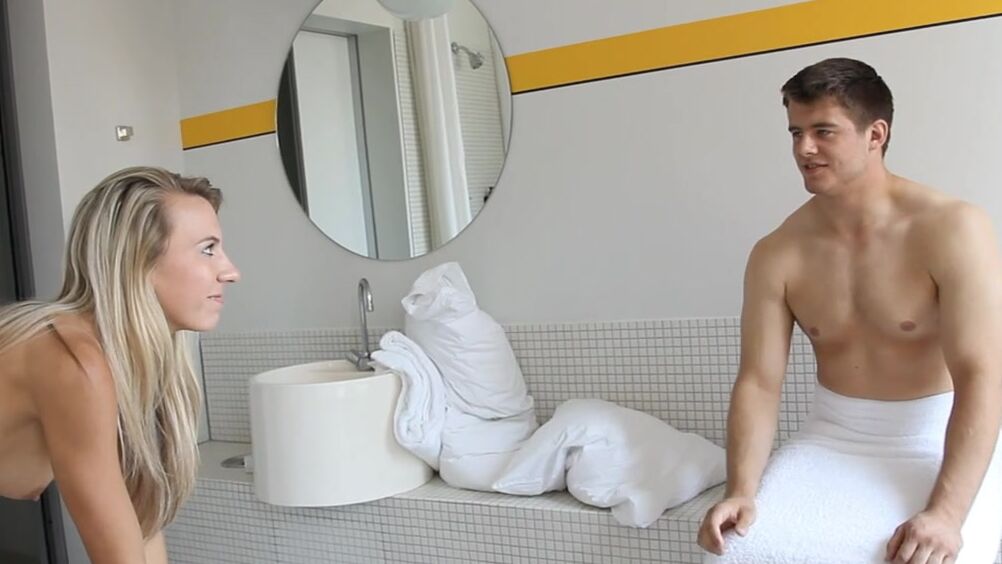 Парень обнаружил пропажу денег и понял, что кроме его телочки этого больше никто сделать не мог. Тогда он решил проучить ее, как следует. Он завязал своей девушке глаза в ванной отеля и привязал руки, пообещав ей приятный эротический сюрприз. Сам же он делать ничего не собирался, он просто дал другу трахнуть ее. Девушка стонала от удовольствия, пока этот чувак нежно вылизывал и ласкал пальцами ее гладенькую пизду. Блондинке настолько нравилось, как ее трахают, что даже после того, как ей сняли повязку, она продолжила стонать и наслаждаться проникновением. Красотка сама седлает член и скачет на нем, а потом ебется раком и получает сперму на попку.