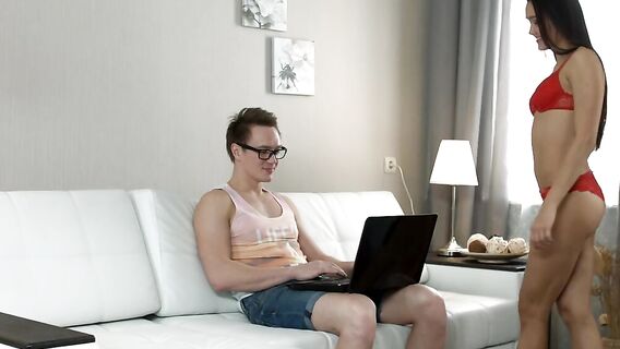 В красных трусиках и лифчике молодая брюнетка выглядела еще более соблазнительной. Глядя на стройную подругу в нижнем белье, парень уже хотел скорее ее раздеть и всунуть свой член в ее влажную пилотку. Он нежно осыпал ее тело поцелуями и ласкал сочную дырочку языком, чтобы разгорячить подружку еще сильнее. Возбужденные взаимными оральными ласками парень с девушкой страстно занимаются любовью, постанывая от блаженства. Длинноволосая девица нежно стонет, пока парень долбит ее бритую пилотку в разных позах. Как только она получила свою порцию оргазма, он кончил ей внутрь, наполнив вагину густой спермой.