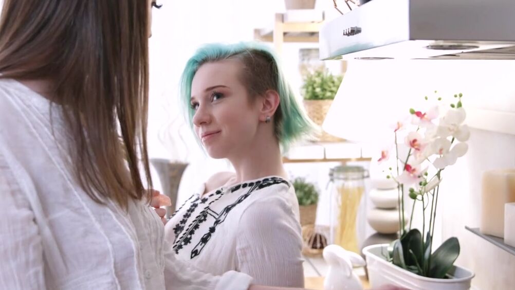 Утренний кофе для двух очаровательных девушек, стал поводом для лесбийских забав. Полуголые и такие сексуальные, они придаются прелюдиям, пока парень наблюдает за ними. Он входит в момент, когда пылкие красотки уже разогреты и попадает в их нежные руки, чтобы испытать радость от жмж. Четыре руки ласкают его тело, брюки растягиваются и возбужденный член попадает в умелые руки. Страстные поцелуи, медленные поглаживания заводят троицу не на шутку. Девушки остаются в одних трусиках, встают на колени и в два ротика ублажают парня, делая ему минет. Стянув трусики с милых попок, парень ставит девушек у стола и жадно вылизывает обе киски, трахая их пальцами под аккомпанемент двойного стона. Нежное куни продолжается, но теперь уже и подружка помогает вылизать пизду своей голубоволосой подружке. Член, наконец, вступает в игру, погружаясь в узкую киску цветной девушки, пока та целует грудь подруги. Скоро парень садится на стул, сверху наездницей запрыгивают брюнетка, жадно поглощая член на всю длину. Снова вернувшись на стол, девушки ложатся в позу 69, и проникновение члена сопровождается оральными ласками. Секс на кухне заканчивается потрясающим камшотом на язычки прелестниц.