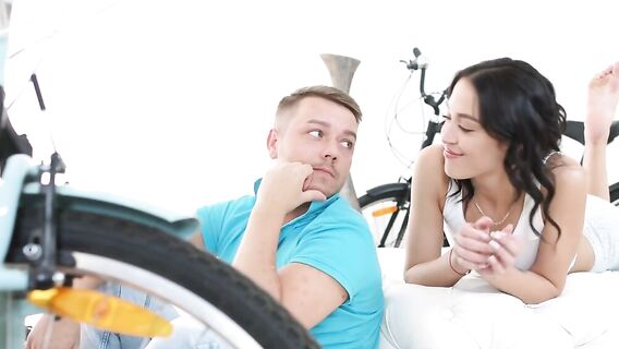 Парень чинит велосипед, увлеченно и погрузившись в процесс. Соблазнительная брюнетка наблюдает за его работой, всячески привлекая его внимание к себе. Жаркий поцелуй, кокетливая улыбка и парень полностью переключается на девушку. Подняв её с пуфика, повернув к себе спиной, он ласкает её худенькое тело, расстёгивает топ, чтобы добраться до маленькой груди. Руки спускаются к шортикам, он стягивает их с неё, а следом и трусики. Девушка раздевает парня, снимает с него футболку, взаимные ласки продолжаются, но теперь уже на маленьком диванчике. Уложив на спину соблазнительную малышку, он делает ей головокружительное куни красивой гладкой киски, заставляя малышку постанывать. Оральные ласки после куни удостаивается и он, его твёрдый член погружается в горячий ротик. Минет, возбуждает ещё сильнее их обоих. Страстный русский секс начинается с миссионерской позы, член погружается до основания, яички шлёпаются о её попку на скорости. В позе наездницы, девушка скачет как на родео, стараясь удержаться верхом, и громко стонет от наслаждения. А после, лёжа на боку, член проникает в попку, явно готовую к такому и принимающую без проблем большой возбужденный член. Анальный секс доводит обоих до экстаза, мощного и животного. Парень заканчивает акт обильным камшотом на лицо партнерши.