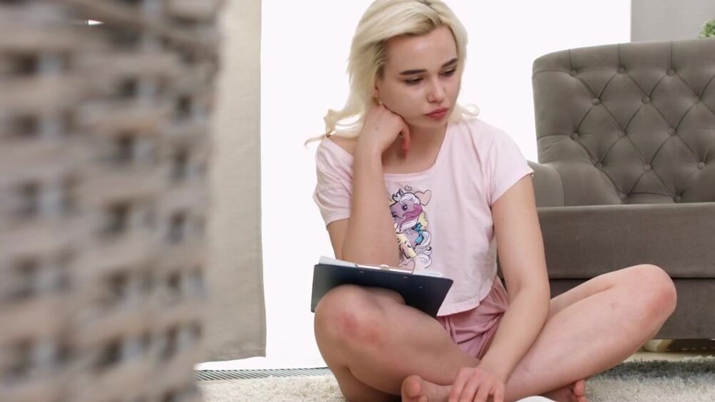 Юная студентка занимается сидя на белом ковре, к ней присоединяется её парень, который хочет отвлечь её хоть немного, чтобы она отдохнула. Его прикосновения, поцелуи переключают внимание блондинки на куда более приятный процесс. Нежная прелюдия становится началом потрясающего секса. Отбросив конспект и ручку, девушка отдаётся желанию своего парня, который усаживает её в кресло, задирает футболку и неторопливо целует по очереди её маленькие сиськи. Целуя её губы, спускаясь ниже к груди, животу, парень добирается до самого сладкого, жаждущей ласк киске. Сдвинув шорты в сторону, он делает девушке куни, жадно вылизывая её влажную щелку. Его язык скользит по губам и клитору, палец входит в девушку, монотонно и глубоко. Закончив с ней, парень встает на ноги и тянет за собой девушку, которая стоя перед ним на коленях в ответ, делает ему, минет. Подняв девушку с колен, он поворачивает её к столу лицом, стягивает промокшие шортики и, задрав одну её ногу на стол, входит в киску. Крепко держа блондинку за шею, он трахает её, погружаясь на всю длину. Меняя позы, наездницы в кресле, боком на полу, пара наслаждается процессом, секс получается очень гармоничный и чувственный. Завершающей точкой становится его оргазм, парень заливает её лицо спермой, когда девушка лежит на полу, на спине.